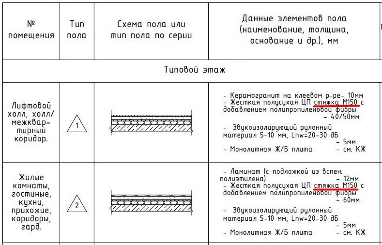 На представленном фрагменте экспликации полов, предусмотрена полусухая стяжка М150 по звукоизоляционному материалу, что является нарушением требований СП 29.13330.2011: 8.5 Стяжки, укладываемые по упругому тепло- и звукоизоляционному слою, должны предусматриваться из бетона класса по прочности на сжатие не ниже В15 и на растяжение не ниже по ГОСТ 26633 или из цементно-песчаных растворов по ГОСТ 28013 или из смесей сухих строительных на цементном вяжущем по ГОСТ 31358 и ГОСТ 31357 с прочностью на сжатие не ниже 20 МПа (марки по прочности М200) и прочностью на растяжение при изгибе не ниже 4,5 МПа. Подписывайтесь на мой телеграм канал, там найдете больше статей и интересной информации. Свои вопросы, пожелания, замечания, фотографии нарушений, предложения по темам статей можете отправлять на почту budnitekhnadzora@yandex.ru.