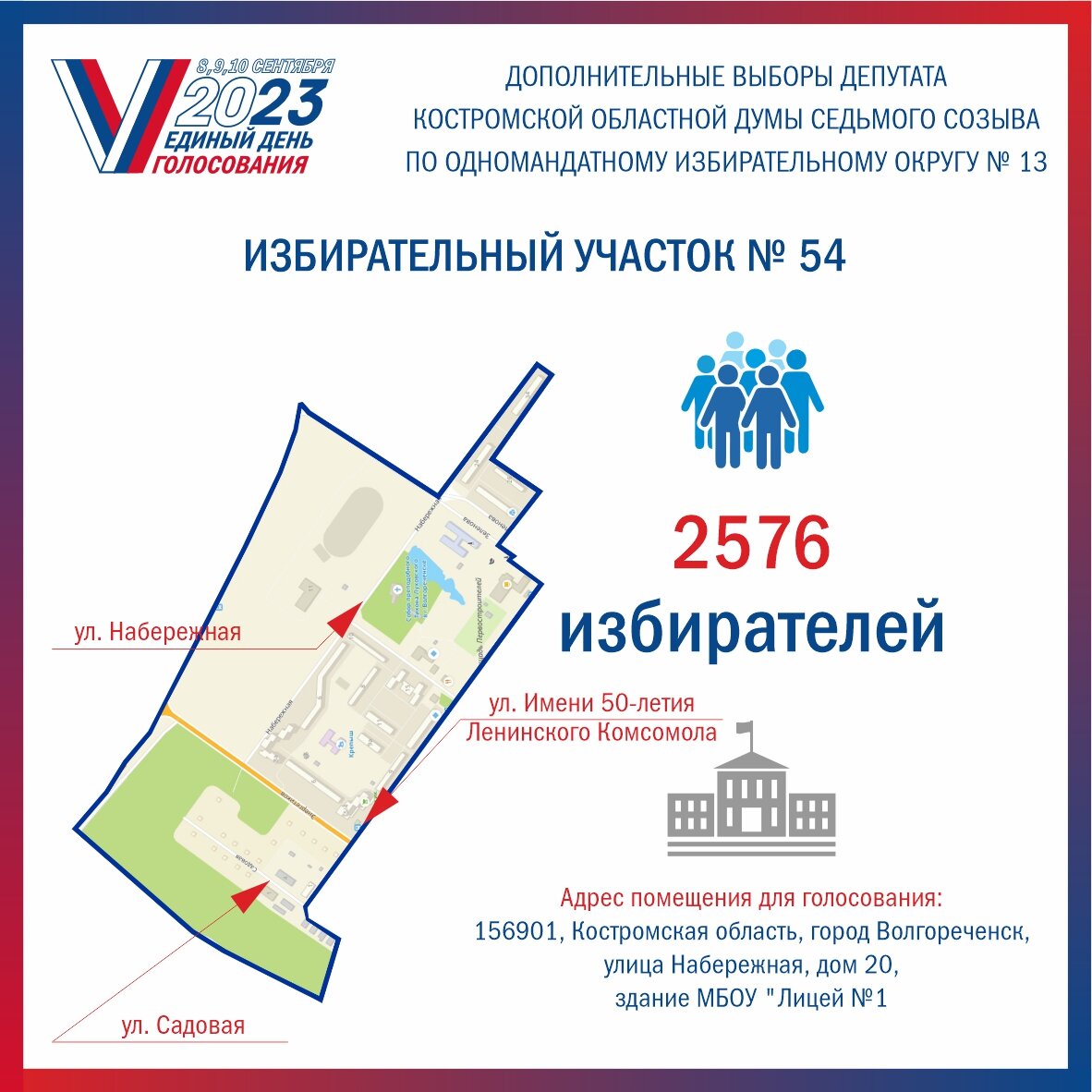 Помещение для голосования избирательного участка № 54 находится в здании лицея № 1 по адресу: г. Волгореченск, ул. Набережная, д. 20.