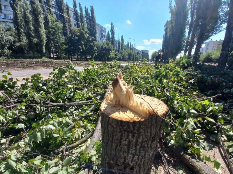 - Полностью уничтожен пяд деревьев по правой стороне, если ехать от Хользунова. Там росли клёны. С другой стороны вырублены липы, но не на всём протяжении участка, видимо, будет вторая серия. Пока полностью не тронут один ряд пирамидальных тополей, но кресты на деревьях есть, а это значит, что и они будут уничтожены.