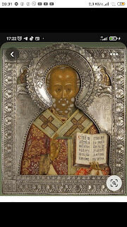 Приветствую... Прислали икону "Святой Николай". Написана маслом на деревянной основе. Нужно было сделать для нее оклад. Как образец подобрали картинку из интернета. Вот, внизу.. С фото из инета нарисовал эскиз, через копировальную бумагу нанес на металлическую латунную пластину толщиной 0.8 мм. Саму же пластину разогрел, разогрел специальную смолу в поддоне и наклеил пластину на смолу. Это делается для того, чтобы от ударов чеканами металл не выгибался, не очень сильно деформировался. И для того, чтобы под ним не было воздуха, чтобы не пробить его насквозь. Для экономии металла нимб расположил так, на месте ризы. Рисунок перевел на металл, начал чеканить. Чеканить надо и с лицевой стороны, и с обратной. С лицевой наносится в основном сам рисунок, а с обратной формируется рельеф. Лист с чеканкой надо было снимать со смолы, отжигать, выравнивать и приклеивать с другой стороны. Чтобы работать с обеих сторон. Процесс отжига паяльной лампой. Смола очень плохо отмывается. Надо смывать раство