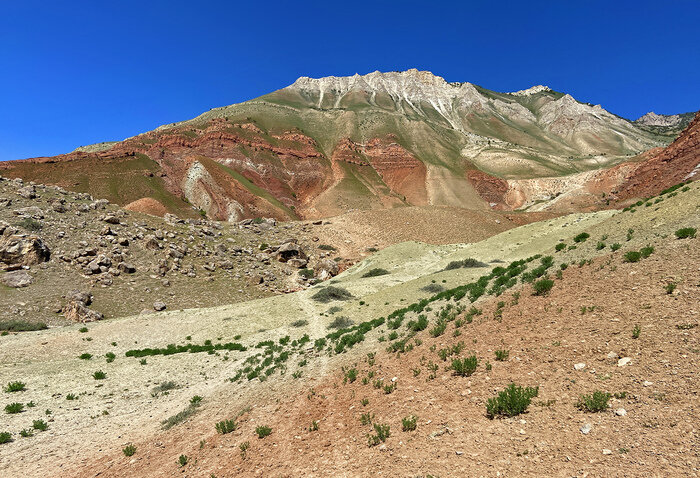 Добрались мы до одной из главных целей нашего месячного путешествия - до радужных гор!! Это всё в Киргизии, которую мы исследовали на предмет прикольных мест. Сначала долетели до города Ош, потом сгоняли в Арстанбап, посетили знаменитую ореховую рощу, посетили знаменитый малый водопад (рекомендуем), познакомились с местными, после чего вернулись в Ош, откуда поехали в совсем дикие горы. Здесь посетили подземное озеро, жили у чабана (экзотика зашкаливает), сгоняли в шикарное ущелье, оценили жизнь в целом, поднялись к плато округлостей. Настала очередь изучить радужные горы. Сначала мы сгоняли в предварительную разведку, найти подходы и вообще понять, есть ли путь. Да, нашли дорогу через простое ущелье. Похоже на палеозойские меловые отложения. По дну ущелья недавно бежал ручей. И убежал. Мы немного пробежались вдоль высохшего ручья, понимая, что главные красоты остаются слева, за хребтом. Но ведь и здесь может быть что-нибудь интересное. Путь вот такой. Вид на правую сторону ущелья (оро