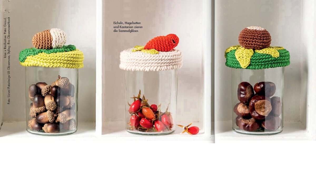 К осени многие собирают шиповник, высушивают мяту, листья смородины, малины и т.д, чтобы потом заваривать чай. Порой, те кто выкладываю фото своей вышивки, например, в соц. сетях или снимают видео, также собирают шишки, каштаны, жёлуди, чтобы использовать их в качестве украшения на фото или видео. Естественно, всё это требуется где-то и как-то хранить. Интересную идею мне подсказал немецкий журнал по рукоделию Anna. Там я увидела банки (контейнеры) с очень интересными вязаными крышками и подумала: "А ведь действительно! Почему бы не сделать крышки на баночки, декор которых будет говорить сам за себя, что в них находится? Есть крышки с вышивкой, но и вязание имеет место быть." На крышку можно связать разные варианты ягод, растений. Например, недавно у меня вышла статья об украшении обеденного стола вязанием и там были варианты вязания цветочков и ягод клубники. Ссылку на ту статью я оставлю под этой. Фактически, в зависимости от того, что связать можно создать себе определённое сезонное