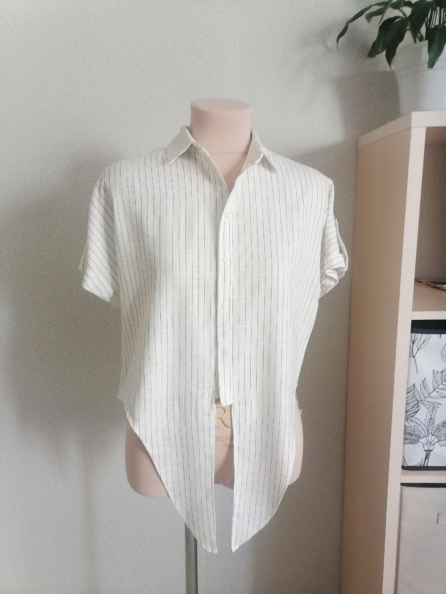 Всем привет! Добро пожаловать на мой канал, где я рассказываю о шитье, рукоделии и создании гардероба ручной работы. Я надеюсь, вы с удовольствием проводите эти жаркие августовские денечки. На улице действительно такая жара, что думать об осеннем гардеробе совсем не хочется. Поэтому я и продолжаю шить летние вещи. Хотя возможно в сентябре я об этом пожалею... но это как говорится совсем другая история. Сегодняшняя статья будет посвящена юбке, которую я перешила из своих старых джинс и рубашке изо льна. Ну начнем по порядку. Сначала я расскажу про рубашку, а в конце поделюсь как перешила джинсы. Рубашку сшила по выкройке, которую можно посмотреть тут . Это блуза свободного силуэта с застежкой на пуговицы. Низ передних деталей оформлен в виде завязок. Рукав короткий, цельнокроеный, с отворотами и декоративными хлястиками на пуговицах. Как мне кажется, такая блуза сейчас очень актуальна и подойдет практически к любому образу, как верхний слой. В выкройке ничего не меняла. А этот лен в