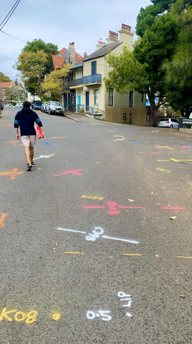 В прошлый раз следили за соседями, а теперь рисуем на асфальте…. Всем привет мои дорогие подписчики! Рада вас видеть! Вас становится всё больше и больше! Это так приятно! Для тех, кто впервые на моей страничке вы можете познакомиться со мной поближе вот здесь, а узнать причину переезда в Австралию здесь. Австралия, конечно, удивительная страна! Мне нравится узнавать всё больше и больше о ней. Мы на днях гуляли с моим парнем, возвращаясь домой я обратила внимание на яркие метки на асфальте. Я раньше их уже замечала, но в этот раз это было как-то по-особенному. Раннее утро, почти никого нет, легкий свежий ветер, облачно, но солнце такое яркое, что даже сквозь облака ослепляет. Эти рисунки находились немного на возвышенности и будто специально так упал свет, чтобы я обратила внимание. Я обратила) Стала разглядывать и спросила, что это такое. Оказывается, когда проводятся коммунальные работы или кто-то делает ремонт и требуется доступ к разным сетям, приезжает специальная служба и оставляе