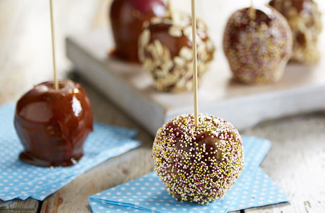 Подготовить яблоки Положите 6 красных яблок в большую миску и залейте кипятком — это удалит остатки воска с кожицы и поможет карамели прилипнуть. Оставьте их на 1 минуту, а затем слейте воду и высушите кухонным полотенцем. На яблоках может появиться белая пыль, но это не страшно, просто убедитесь, что они хорошо высохли. Вставьте шпажки Аккуратно воткните деревянную шпажку в верхушку каждого яблока и проткните сердцевину. Вы не хотите, чтобы шампур вышел с другого конца, просто нажмите достаточно, чтобы он был безопасным. Положите яблоки на шпажках вверх на противень, застеленный бумагой для выпечки с антипригарным покрытием. Сделать карамель Добавьте 300 г золотой сахарной пудры в кастрюлю среднего размера с 3 столовыми ложками золотого сиропа и 5 столовыми ложками воды. Встряхните воду, чтобы она покрыла сахар, но не перемешивайте. Нагрейте смесь на медленном огне, пока сахар не растворится. Увеличьте огонь и кипятите сахарный сироп, пока он не достигнет 140°C на сахарном термометре