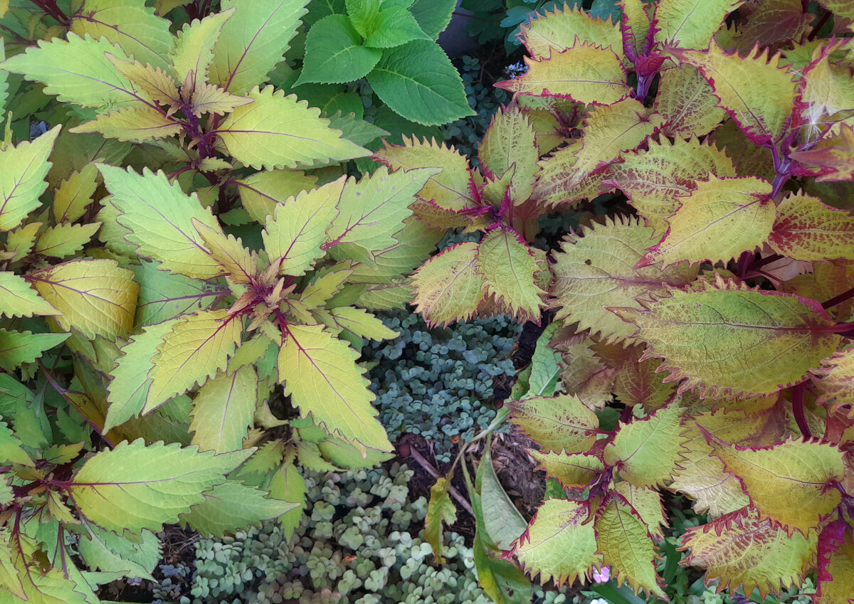 Этих товарищей я называю осенними колеусами. По двум причинам. Первая — это, конечно, цветовая гамма. Типично осенняя, охровая. Это не самые яркие сорта, даже если сажать их на прямом солнце. Более того, на прямом солнце они будут выцветать до белого цвета. А вот такой желтовато-бронзовый оттенок колеусы приобретают на клумбочке, куда солнце приходит к 14 часам и уходит после 17 часов. Вторая причина такого странного названия — расцвет красоты. Растут оба медленно, хотя форма куста разная. У верхнего раскидистый и не высокий. Совершенно не вытягивается, много боковых побегов, а для формирования куста никакая прищипка не нужна. Нижний — сорта Henna. Вот он склонен вытягиваться и отращивать некрасивые длинные междоузлия. Его приходится регулярно прищипывать, регулируя рост. Но оба достигают пика формы только к августу! Но самое прекрасное с осенними колеусами случается в октябре и только если посадить их рядом с хризантемами. Они начинают играть в дуэте. Вот здесь колеус Хенна и розов