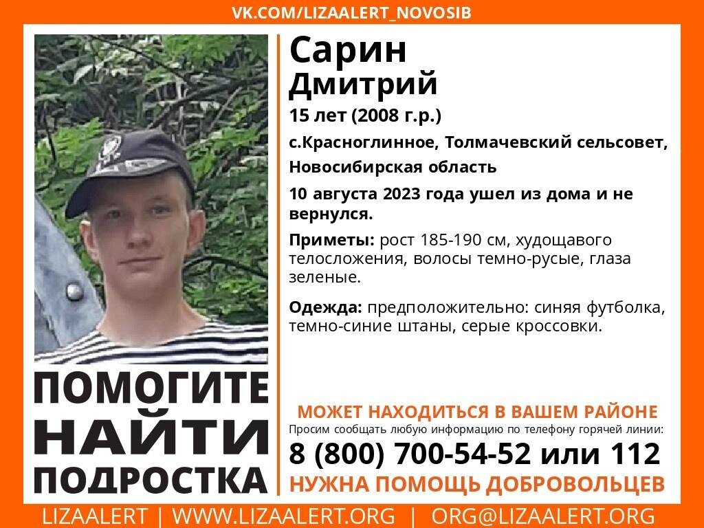 В Новосибирске уже четыре дня неизвестно местонахождение 15-летнего Дмитрия Сарина. 15-летний Дмитрий Сарин пропал в Новосибирской области. Об этом сообщается на сайте поискового отряда “Лиза Алерт” в НСО. “Пропал #Сарин Дмитрий, 15 лет, с.Красноглинное, Толмачевский сельсовет, Новосибирская область. 10 августа 2023 года ушел из дома в неизвестном направлении”, - говорится в сообщении волонтеров. По данным поисковиков, рост подростка около 185-190 см, у него худощавое телосложение, зеленые глаза и тёмно-русые волосы. Сарин был одет в темно-синие штаны, синюю футболку и серые кроссовки. Если вы знаете о местоположении девушки, просьба связаться с ПСО по номеру 8-800-700-54-52 или в полицию по номеру 112. Напомним, в Новосибирске исчезла девушка с розовыми волосами..