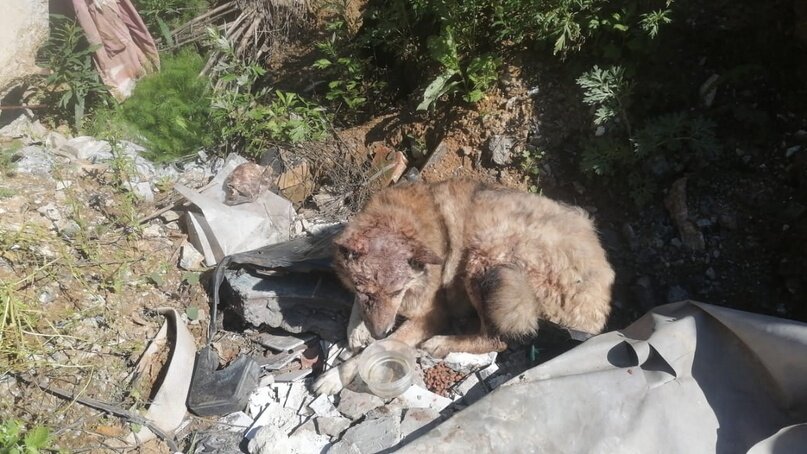 Назвали Юта. Собака в возрасте. Очень доверчивая и терпеливая. Возможно, так решил хозяин избавиться. Была в ошейнике и на поводке. Пролежала она так в яме несколько дней. Повезло, что ЧМТ открытая, при закрытой она давно бы погибла от кровоизлияния.