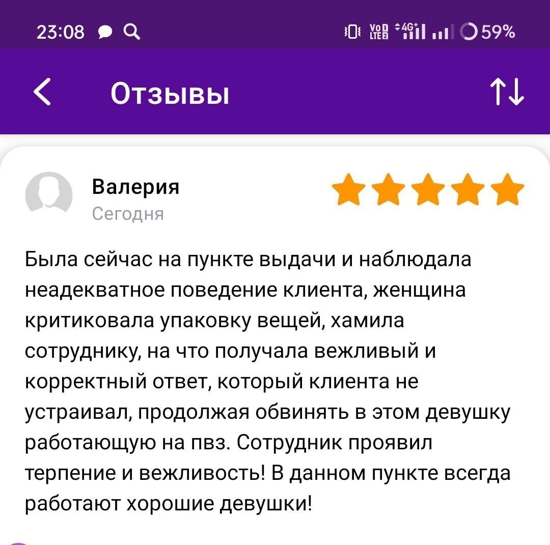 Адекватные клиенты защитят сотрудника! К слову,у нас на пункте тоже случай был,когда одна клиентка не воспринимала корректные ответы и другая клиентка за меня заступилась.А та ретировалась. А неадекватные еще и между собой дебош устроят Клиенты в оценке пункта пишут,что пвз завален... ВСЕ ПРЕТЕНЗИИ к тем,кто ЗАКАЗЫВАЕТ!!! Если уж САМ ВБ по горячей линии не помог,то пвз и подавно не поможет. Осеннее обострение... Пвз сейчас на каждом шагу.В чем проблема выбрать тот,где парковка есть? А зимой ночнутся снег и лёд... Что, сотрудники пвз в радиусе 200 м вокруг должны территорию чистить? У нас были такие "особенные" - предъявляют претензии к тому,за что пвз не отвечает. Когда есть ДГХ и ЖКХ. У нас пункт на 1м этаже жилого дома, так пришел мужик в том году и орал,кто его плетущийся виноград на лоджии срезал🤣 нашел крайних🤦♀️. Все добра🤗