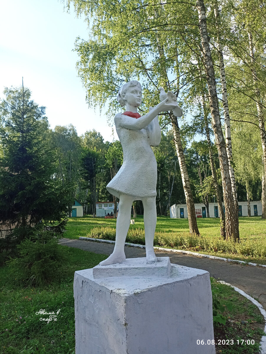 Должно быть страшно. Потому что это одна скульптура из пары. Раньше ещё и пионер стоял. Теперь его нет. Куда он делся доподлино неизвестно, возможно, разрушился и был демонтирован, а может и не было его, но лагерное предание гласит, что его уничтожила молния, и с тех пор пионерка ночью спускается со своего постамента и ищет себе в пару нового мальчика... И тот, кого она заметит – окаменеет. Впечатлительные мальчишки в сумерках носа из домика боялись высунуть.