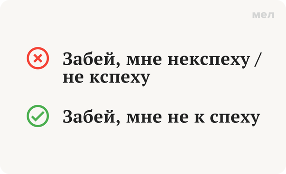 Спешка — главный враг порядка, а он в грамотных текстах должен быть обязательно. Не спеша и по пунктам еще раз вспоминаем (и запоминаем), как пишутся фразеологизмы, выполняющие роль наречий. Правильно: не к спеху «Мне не горит», «еще успею», «полно времени» — у выражения «не к спеху» есть масса более простых в написании синонимичных словосочетаний. Но мы же не ищем легких путей, поэтому разберемся с самым сложным. Итак, «не к спеху» — это предикативное наречие, оно образовано от предложно-падежной формы существительного «спех». Да, такое слово существует, это устаревший синоним слова «спешка». В современном русском языке оно используется в ограниченном количестве устоявшихся конструкций: «не к спеху», «без спеха» и т. д. Почему же нам хочется слить это существительное с предлогом «к»? Вероятно, тут работает ложная аналогия с наречиями вроде «книзу», «кверху», «кряду» и даже с «наспех»: все они пишутся слитно, и то же самое по инерции хочется сделать со словами из нашего примера. Однако