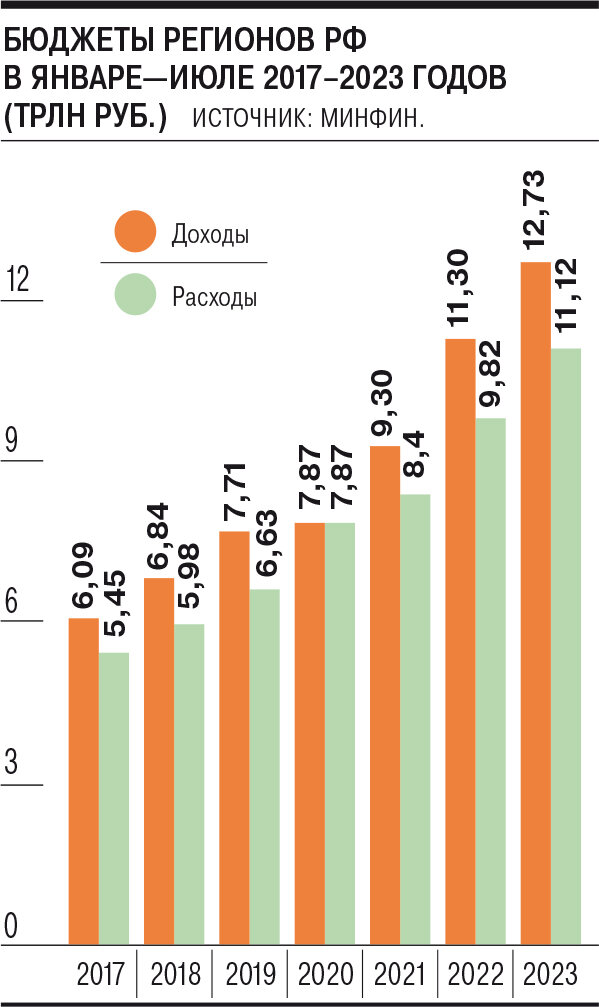Консолидированные бюджеты российских регионов по итогам семи месяцев 2023 года исполнены с внушительным профицитом — 1,566 трлн руб., следует из опубликованной Минфином статистики. Годом ранее этот показатель был лишь немногим меньше — 1,48 трлн руб. Промежуточным профицитом общий бюджет субъектов РФ заметно от отличается от федерального, закрытого по результатам января—июля с дефицитом в размере 2,817 трлн руб., или 1,8% ВВП (см. “Ъ” от 9 августа). Такое различие в знаке исполнения объясняется прежде всего разной структурой доходной части. Региональные бюджеты наполняются в основном за счет налога на прибыль и на доходы физических лиц, не испытавших падения поступлений. В основе же федерального бюджета — НДС и НДПИ, и доходы по налогу на добычу на снижении цен на российскую нефть упали примерно наполовину. Кроме того, регионы ограничены в своих возможностях наращивать расходы, не имея, в отличие от федерального центра, значимых резервов и емких рынков для размещения облигаций для закр