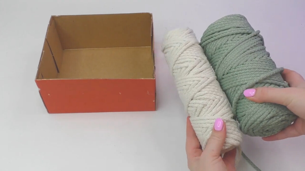 В хозяйстве часто используют различные боксы, ящики, контейнеры для хранения вещей. Этот способ очень удобен, так как помогает тематически рассортировывать вещи или предметы. Сегодня я предлагаю сделать плетеный бокс для вещей из старой обувной или какой-либо другой картонной коробки. Материалы, которые нам потребуются в работе: Замеряем высоту коробки. К размеру добавляем примерно 5-6 см. По размеру нарезаем веревку. Нам потребуется четное количество нитей. Приклеиваем нити к нижней части коробки, по всему периметру. Когда вертикальные нити готовы, начинаем горизонтально вплетать белую веревку. Отгибаем 2 вертикальные зеленые нити и приклеиваем кончик белой веревки. Далее 2 нити пропускаем и отгибаем следующие 2 нити. И так далее соблюдаем порядок 2 на 2. Приклеиваем горизонтально, по всему периметру 2 белые веревки. Следующий ряд из белой веревки приклеиваем в шахматном порядке. Таким образом оплетаем полностью боковую часть коробки. Подклеиваем верхний край и обрезаем лишний кра