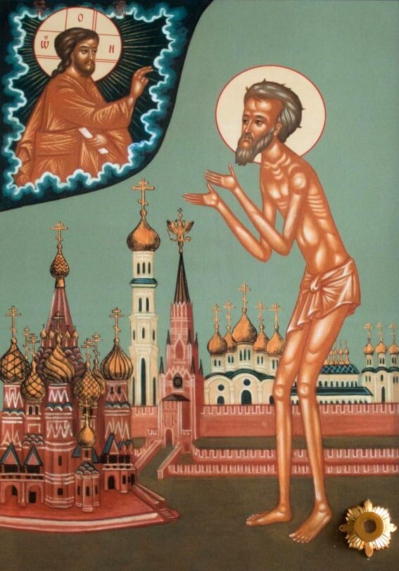 На иконах святого часто изображают нагим, это также подчеркивало, что он презирает все земное, считает, что только отказавшись от имущества, можно попасть в рай. На самом деле юродивые не ходили обнаженными, обычно их тело прикрывала холщовая рубашка, но она могла быть с прорехами.