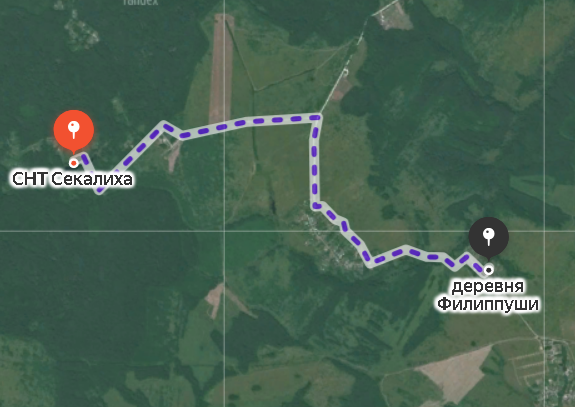СНТ "Секалиха" находится в двадцати километрах от моего дома. В хорошую погоду я езжу в Секалиху на велосипеде. Но меня напрягает шести километровый участок дороги, где не предусмотрена велосипедная дорожка. Часто приходится съезжать на обочину. По Яндекс-карте я определила ещё два варианта пути: через лес от села Мосино и через село Богослово. Приятнее ехать на велосипеде по дорогам с грунтовым покрытием. И вот в четверг 10 августа 2023 года после игры в теннис я решилась впервые поехать в СНТ по короткому пути. Накануне был дождь, и с утра было не жарко, пасмурно. Я выехала в 13:00 с дачного участка СНТ на Содышке, где в прошлый раз оставила велосипед. В 13:11 перетащила велосипед через забор с западной стороны территории СНТ. Новый короткий вариант пути через Филиппуши и Нежитино одобрил накануне сосед-дачник Женя. Впереди не тринадцать километров, как обычно через Зелени, а только девять! По указателю Юрьев-Польской дороги на седьмом километре была в 13:18 На восьмом километре от