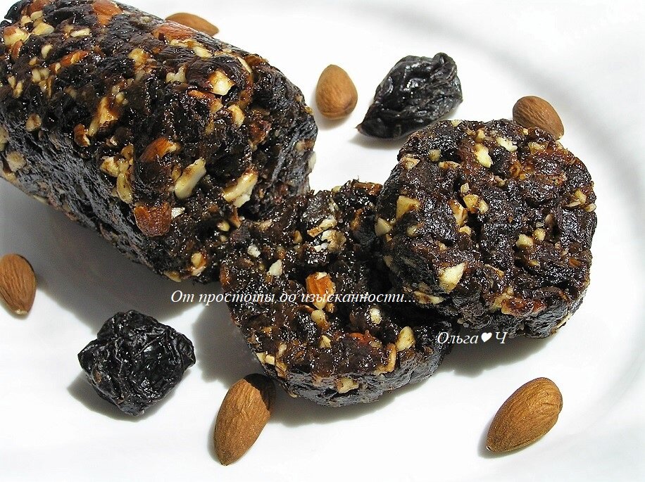 1-2 ст. л. мятного сиропа по моему рецепту: Приготовление: Миндаль обжарьте, остудите и измельчите в блендере так, чтобы остались небольшие кусочки. Чернослив промойте, обсушите, измельчите в блендере. Добавьте орехи и мятный сироп, хорошо перемешайте. Если масса суховата, добавьте 1-2 ч. л. воды. Выложите массу на пищевую пленку. Заверните в плотный батончик, свернув пленку как конфету, уберите в холодильник на час. Аккуратно снимите пленку, нарежьте батончик ломтиками и подавайте. Приятного аппетита!