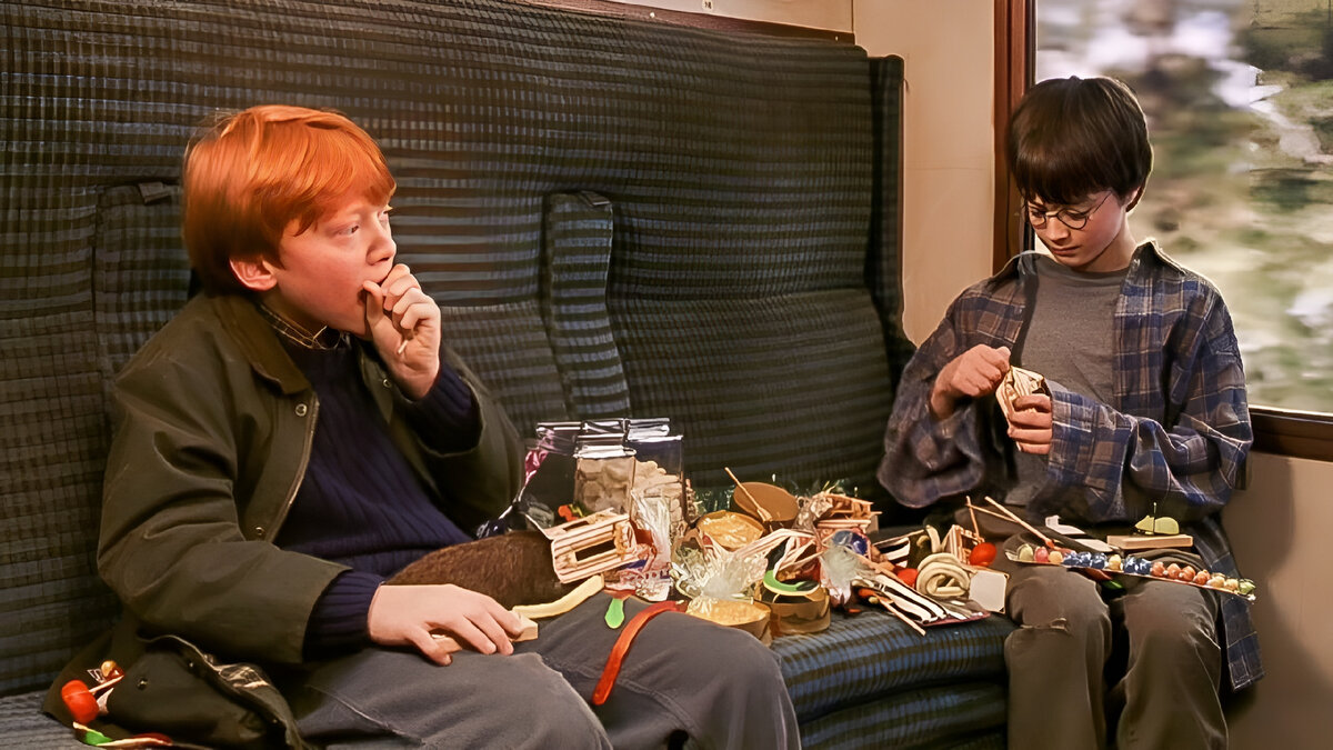 Гарри сталкивается с волшебными сладостями Хогвартс-экспресса в первое своё путешествие на нём и сразу скупает буквально всё.