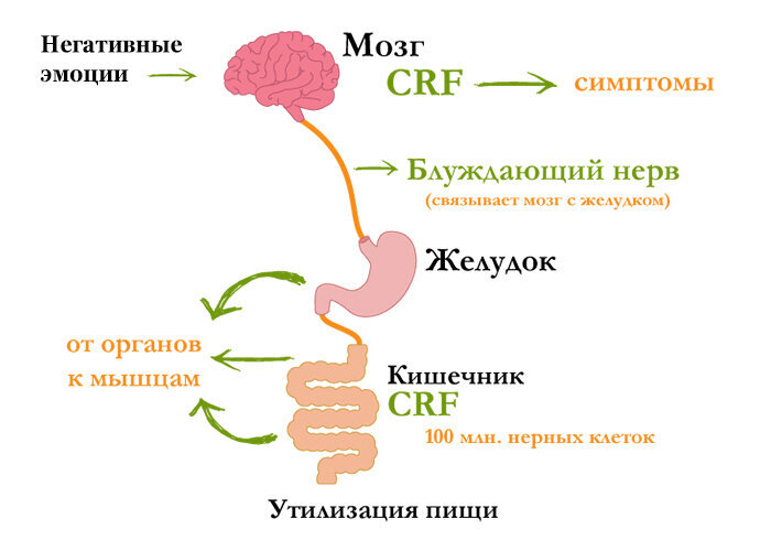Одним из частых последствий стресса является нарушение работы пищеварительной системы, которая тесно взаимодействует с головным мозгом с помощью многочисленных нейронов расположенных в ней. Органы пищеварения постоянно получают сигналы о физическом, психологическом, эмоциональном состоянии всего организма и реагируют на них. Поэтому эмоции, приятные ощущения и чувства могут влиять на состояние нашего здоровья, как позитивно, благотворно, так и негативно. Влияние стресса может прослеживаться в нарушении работы любого из участков пищеварительной системы и проявляться в виде: - заброса пищи из желудка в пищевод; - ощущения переполненности желудка после еды вследствие спазма; - изжоги и болей; - вздутия и усиленной отрыжки; - синдрома раздраженного кишечника: диарея или запор, которые могут быть самостоятельным явлением или перемежаться. Такие явления называются функциональными расстройствами органов пищеварения. Их отличительной особенностью является отсутствие подтвержденной органической