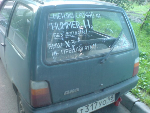 Какие только надписи не встречаются на автомобилях. С помощью их автомобилисты привлекают к себе внимание, украшают автомобиль и даже о чем-то пытаются предупредить. Предлагаю посмотреть очередную подборку смешных надписей на автомобилях. Некоторые из которых еще и сопровождаются рисунком. Смотрится это очень интересно. Фотографии смешных надписей на автомобилях. 1. Почему-то именно водители автомобилей "Ока" часто шутят над собой. Наверно потому что это очень маленький автомобиль, при виде которого на лице появляется улыбка. Особенно если он покрашен в какой-нибудь интересный и необычный цвет. Вот и этот автомобилист решил подшутить, что меняет свой автомобиль на Hummer или BMW без доплаты. Конечно же все это шутка, но на самом деле идея не такая и плохая. 2. Интересно, что же означает надпись "педагог" на автомобиле? Можно подумать, что на автомобиле ездит преподаватель. Но на автомобиле какие-то еще странные наклейки. Может быть это реклама репетитора? Тут есть над чем подумать. 3