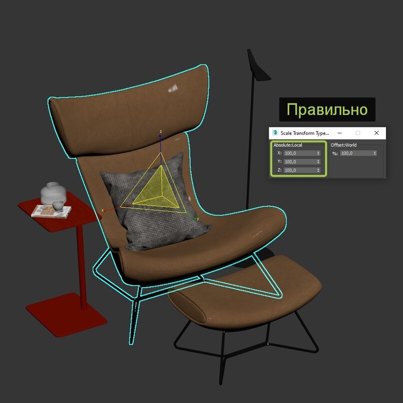 Многие готовые модели, которые вы скачиваете могут быть настроены с ошибками, и важно проверить их и исправить, чтобы на рендере они выглядели корректно и красиво. В этой статье приводим список того, что и как необходимо проверять и исправлять в каждой модели. Проверка масштаба Первым делом нужно проверить масштаб объектов и источников света, если они есть. Для этого нужно выбрать объект и щелкнуть правой кнопкой мыши по инструменту масштабирования. В этом окне в левой колонке по всем 3 счетчикам должно показывать 100, без минусов: Ориентация полигонов У полигонов в максе есть две стороны — передняя и задняя. Важно следить, чтобы полигоны на моделях всегда были развернуты лицевой (передней) стороной наружу. Довольно редкая ошибка, но все-равно встречается. Полигон повернутый «задней» стороной при выделении будет окрашиваться в темно-красный цвет, тогда как правильная сторона будет иметь ярко-красный оттенок. Чтобы исправить выделяем этот полигон и жмем команду Flip: Соблюдение правила