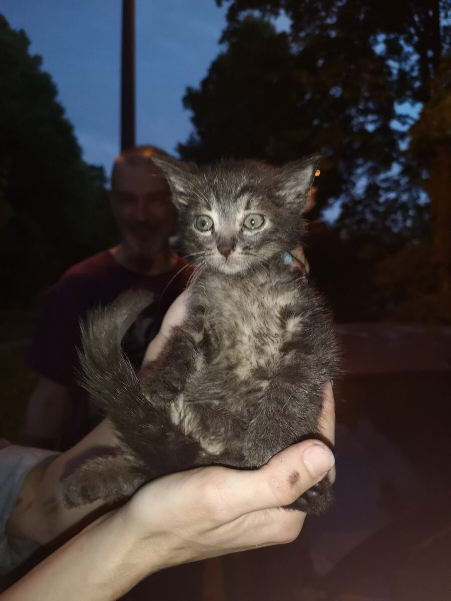 СПб. Охта, Краснодонская ул. Нужен док котенку. Найден под капотом машины. Забирать некуда, пока сидит в переноске в машине