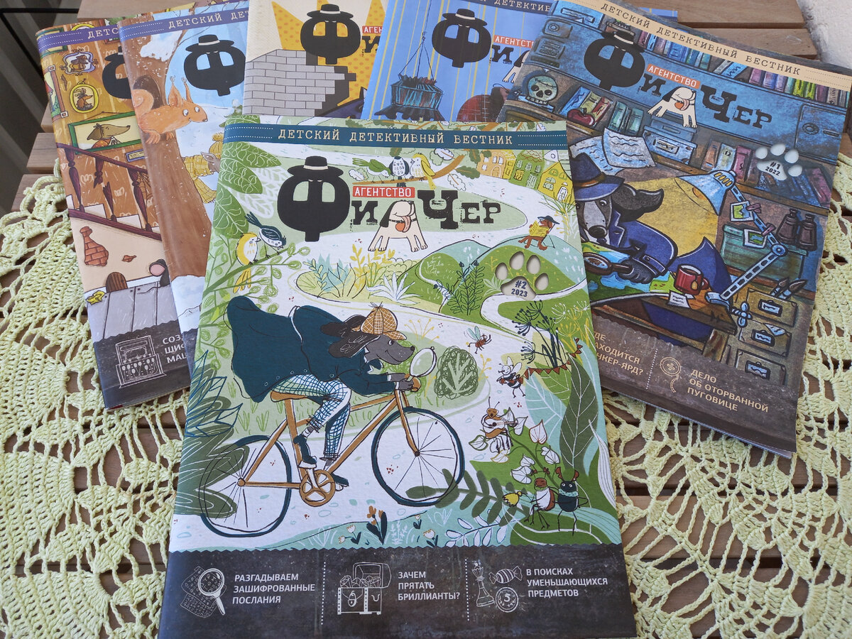 Продолжаю рассказ об интересных детских журналах. На прошлой неделе рассматривали "Чердобряк" - любимый журнал младшего племянника, а сегодня будем узнавать о пристрастиях старшего. У нас любопытно получилось: "Агентство Филчер" - это "младший брат" журнала "Чердобряк", но именно он и нравится старшему племяннику (недавно исполнилось 12 лет). "Агентство Филчер" - журнал молодой, первый номер вышел в 2022 году, его периодичность - 1 журнал за 3 месяца, т.е. четыре номера в год. На данный момент вышло 6 номеров: Про название журнала лучше всего скажет Марина Танцырева, главный редактор: Название журнала «Агентство Филчер» имеет три официальные расшифровки. Первое - ФИЛиал ЧЕРдобряка. Второе – мелкий воришка в переводе с английского. А именно с мелкими преступниками борется главный герой нашего журнала. Третье – аббревиатура «Агентства Филчер» - АФ, псу-детективу так и положено говорить, правда? Прототипом главного героя журнала стал пёс главного редактора – русский охотничий спаниель Ма