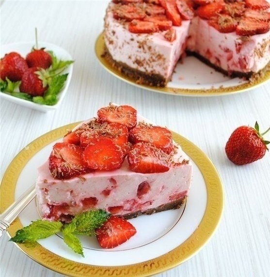 Ингредиенты Масло сливочное топленое 60 г Печенье шоколадное 150 г Клубника 250 г Йогурт клубничный 300 г Творог мягкий 200 г Сахар 100 г Сливки 33%-ные 200 мл Молоко 50 мл Желатин 2 столовые ложки 1. Все продукты, кроме сливок, заранее достать из холодильника, чтобы они были комнатной температуры. 2. Дно и бортик разъемной формы диаметром 19 см выложить пергаментом. Печенье размять в крошку (можно вместо шоколадного взять обычное печенье и добавить в крошку 1 столовую ложку какао), перемешивая, частями добавить сливочное масло, полученную массу хорошо утрамбовать на дно формы и убрать в холодильник. 3. В горячем (но не кипятке) молоке тщательно растворить желатин, остудить смесь до комнатной температуры. 4. В миске смешать миксером йогурт, творог и сахар, пока сахар не растворится, затем добавить клубнику, порезанную маленькими кубиками, помешивая, влить тонкой струйкой желатин, хорошо перемешать и убрать смесь в холодильник минут на 30, пока желе не начнет сл