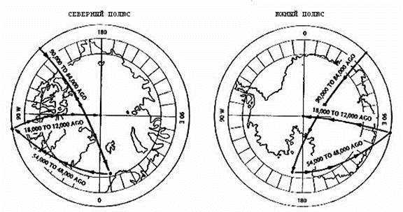 Как известно по палеомагнитным данным, средняя скорость дрейфа геомагнитных полюсов составляет несколько см/год, а направление дрейфа имеет явно случайный (броуновский) характер. Траектории дрейфа палеомагнитных полюсов «тяготеют» к географическим полюсам. Магнитные полюсы дрейфуют совсем по-другому в момент инверсий и экскурсов. В этом случае они всегда движутся с севера на юг или наоборот, и всегда по выделенным одним и тем же траекториям – «коридорам» (рис. 3).