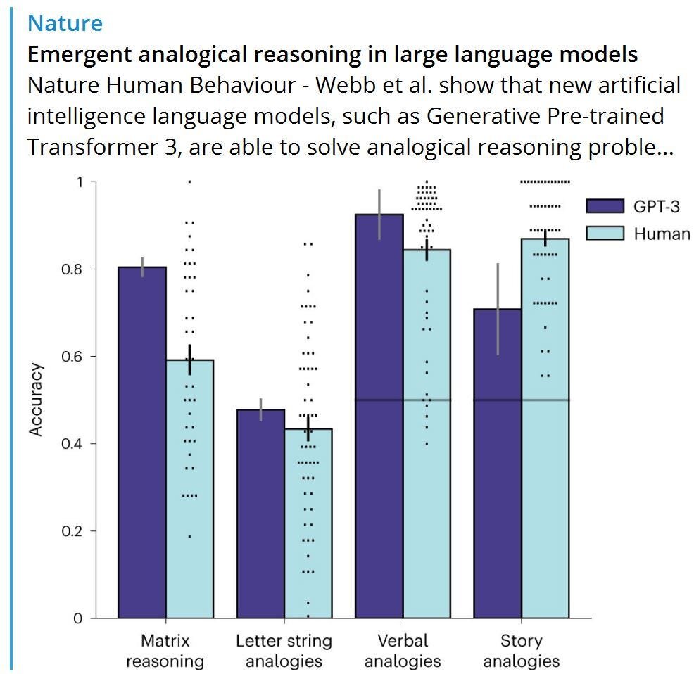 Экспериментально доказано — LLM «думают» как люди, а не имитируют наше мышление на основе статистик Это сенсационное открытие «Лаборатории вычислительного зрения и обучения» Университета Калифорнии (руководитель — проф. Хунцзин Лу) прошло научное рецензирование и опубликовано в новом выпуске Nature Human Behaviour под заголовком «Эмерджентное рассуждение по аналогии в больших языковых моделях» — без пэйвола см. здесь. Суть сделанного открытия в следующем. Экспериментально доказано, что большие языковые модели (LLM) уровня GPT-3 и выше уже достигли и даже превосходят уровень людей при решении задач: ✔️ абсолютно новых для них (с которыми они никогда не сталкивались); ✔️ требующих умения рассуждать “с нуля”, без какого-либо прямого обучения; ✔️ требующих способности к абстрактной индукции паттернов — т.е. абстрагирования от конкретной задачи и рассуждения по аналогии. Рассуждения по аналогии — это квинтэссенция способности человека к абстрагированию, являющейся основой человеческого инте