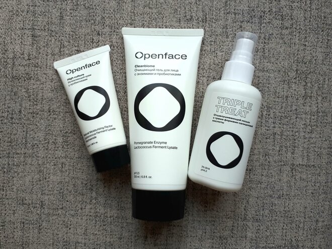 Предлагаю вам поближе познакомиться с косметикой российского бренда Openface. По сути это не только производитель косметики, но и сервис, в котором можно проанализировать состояние своей кожи и получить персонально созданную сыворотку. Такой интересный проект создали три девушки с опытом работы в IT-сфере с оригинальным взглядом на косметический рынок. Openface CleanbiomeОчищающий гель для лица с энзимами и пробиотиками Средство предназначено для бережного очищения кожи любого типа, в составе используются мягкие ПАВ, пробиотики и смягчающие компоненты. Туба большая, объём 200 мл. Мне такой упаковки хватает на несколько месяцев, я всегда пользуюсь гелями для умывания, для меня они всегда нужный расходник. Для защиты от вскрытия носик тубы запаян фольгой. Текстура геля не слишком густая, норовит растекаться по коже. Аромат практически отсутствует. В описании сказано, что гель практически не пенится, но на самом деле мягкую негустую пенку он всё же создаёт. Это улучшает его очищающие свой