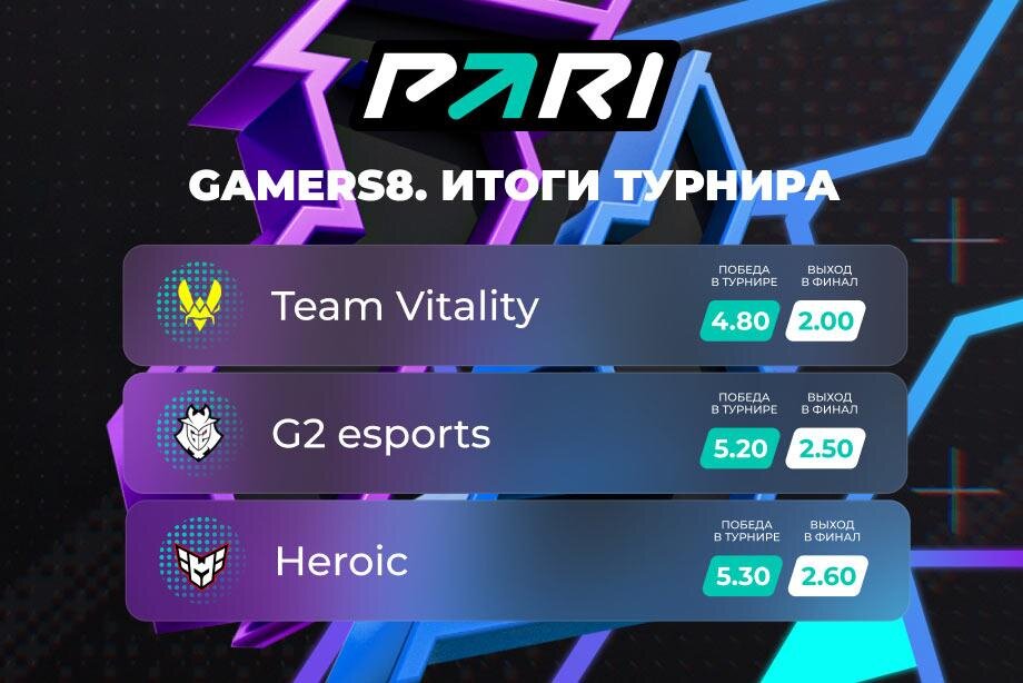 16 августа в Эр-Рияде стартует турнир Gamers8 2023 по CS:GO. На чемпионате выступят 16 топовых команд со всего мира, среди которых Team Vitality, G2 Esports, Heroic, FaZe Clan и другие гранды. Участники поборются за призовой фонд в размере одного миллиона долларов. Букмекерская компания PARI открыла линию на победителя чемпионата. По оценкам аналитиков, фаворитом чемпионата будет Team Vitality. Team Vitality – действующий чемпион мейджора, однако в новом сезоне после замены в составе коллективу ещё не удалось выиграть ни одного трофея. На завершившемся недавно IEM Cologne 2023 французский ростер заняло 3-4 место. Несмотря на это, аналитики дают коэффициент 4,80 на чемпионство Vitality в Эр-Рияде. Главными преследователями Team Vitality станут G2 и Heroic. На их триумф можно поставить с котировками 5,20 и 5,30 соответственно. G2 стала триумфатором IEM Cologne 2023. Heroic, в свою очередь, продолжает удерживать первое место в мировом зачёте, но на IEM Cologne 2023 датский ростер занял то