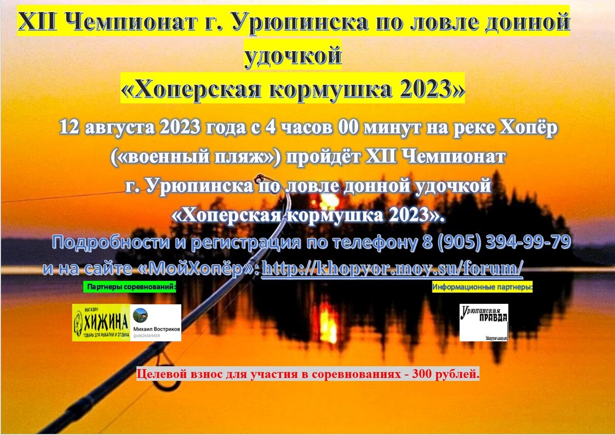 12 августа 2023 года в городе Урюпинске на реке Хопёр прошел XII Кубок муниципального образования городского округа города Урюпинск по ловле донной удочкой "Хопёрская кормушка - 2023". Соревнования были организованы Клубом рыбаков Прихопёрья, отделом молодежной политики, физической культуры и спорта администрации городского округа город Урюпинск.