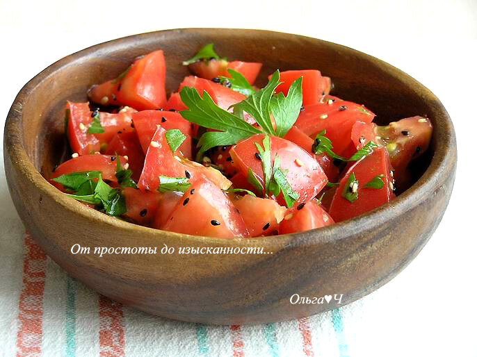 0,5 пучка петрушки Приготовление: Помидоры нарежьте кусочками, добавьте измельченную петрушку, перемешайте. Полейте уксусом, лимонным соком и маслом. Посолите, поперчите, добавьте обжаренный кунжут. Перемешайте, дайте немного настояться. Разложите по салатникам и подавайте. Приятного аппетита!