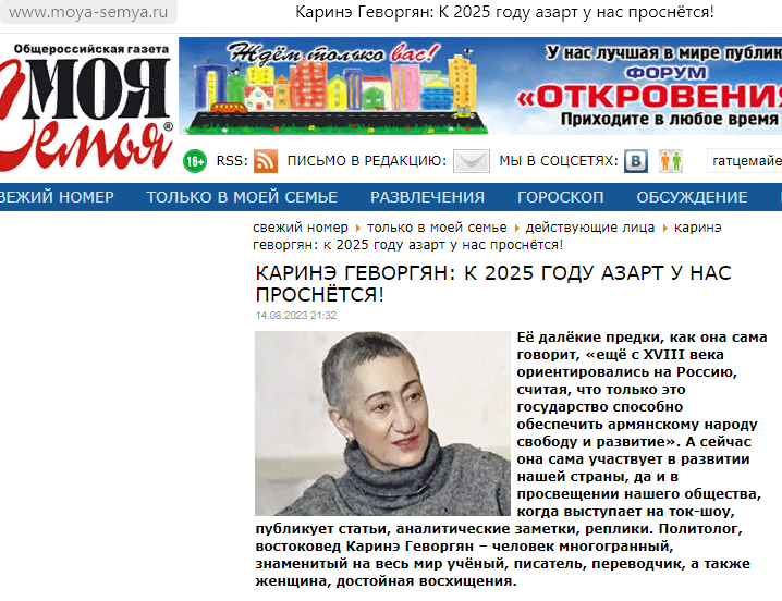 Её далёкие предки, как она сама говорит, «ещё с XVIII века ориентировались на Россию, считая, что только это государство способно обеспечить армянскому народу свободу и развитие». А сейчас она сама участвует в развитии нашей страны, да и в просвещении нашего общества, когда выступает на ток-шоу, публикует статьи, аналитические заметки, реплики. Политолог, востоковед Каринэ Геворгян – человек многогранный, знаменитый на весь мир учёный, писатель, переводчик, а также женщина, достойная восхищения.