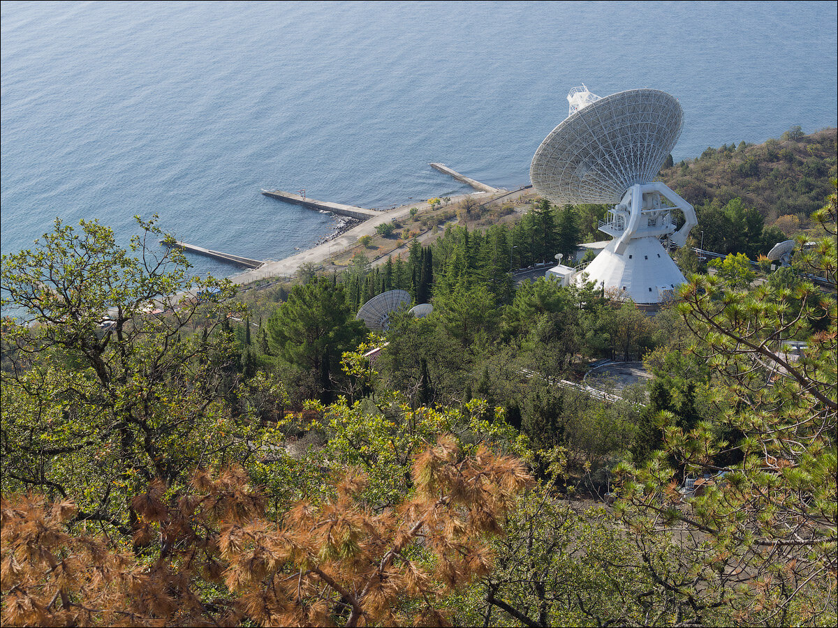 Прошагав грунтовкой по хвойному лесу, мы вышли на площадку над обрывом. Просто обалдеть! Под нами — обсерватория! Огромный белоснежный радиотелескоп над синим морем. Невозможно огромный! Здесь наблюдают за приближающимися к Земле астероидами. Что с ним делать, если заметят — не очень понятно, но отслеживают. Ну и вид отсюда! Реально удивительный!