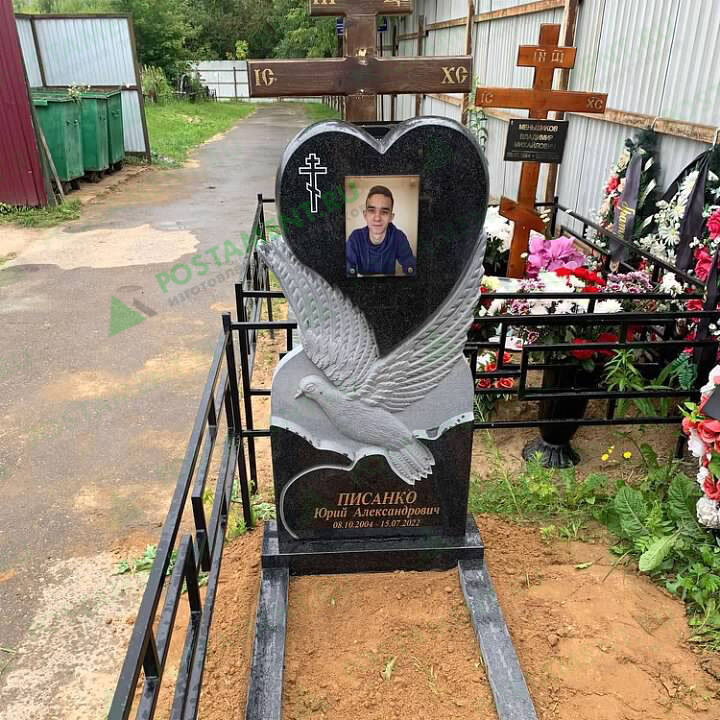 Стела визуально поделена на три части. Верхняя часть - сердце с портретом усопшего, поддерживаемое крыльями. Средняя часть - голубка в облаках, символизирующая чистую душу. Нижняя часть стелы - облако, на котором размещена информация о покойном.