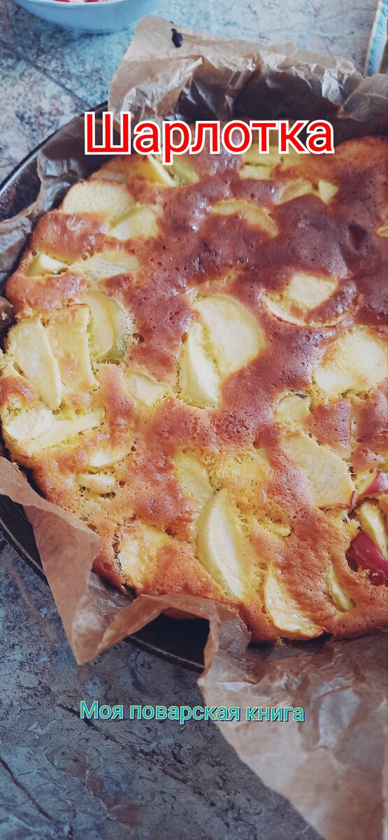 Всем привет!!! Сейчас все активно пекут Шарлотку. И с яблоками и абрикосами, и сливами, малиной. Мы тоже не исключение. По этому рецепту печёт моя мама,от неё я и научилась. Беру: 4 яйца 1 стак сахара + 4 стол. л. сахара для яблок 4- 5 крупных яблока Ванильный сахар Разрыхлитель Соль 1 стак муки Можно кунжут,чтобы посыпать сверху на пирог По желанию сливочное масло сверху на пирог кусочками Сметана для поливки сверху Яблоки режу пластинками и засыпаю 4 ст. ложками сахара. Пока яблоки отдают сок, взбиваю яйца с сахаром до белой пены, щепотку соли добавляю. Потом ванильный сахар или просто ванилин и разрыхлитель. Просеянную муку постепенно ввожу в тесто. Тесто готово. Вливаю его в яблоки. Перемешиваем. Пергамент мну в комок. Потом распределяю по широкой сковороде. Сбрызгиваю маслом. Выкладываю тесто. Можно посыпать кунжутом хорошенько если есть у вас. Или положить кусочки сливочного масла. Будет вкуснее 😋. На данный момент нет у меня в наличии ни того не другого. Пеку н