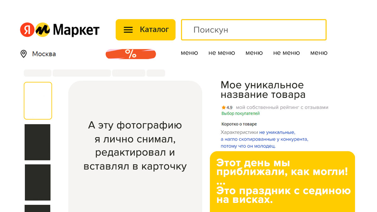 Добрым утром поделился Яндекс Маркет. Пояснив, что контент каждого продавца в карточке товара станет уникальным, а именно: Есть нюанс. Некоторые фотографии, которые повторяются у всех продавцов, останутся общими. Характеристики, цвет, габариты — тоже. У нас в карточке на сайте до сих пор остались фото, которые мы не загружали, зачем их оставили — не ясно.