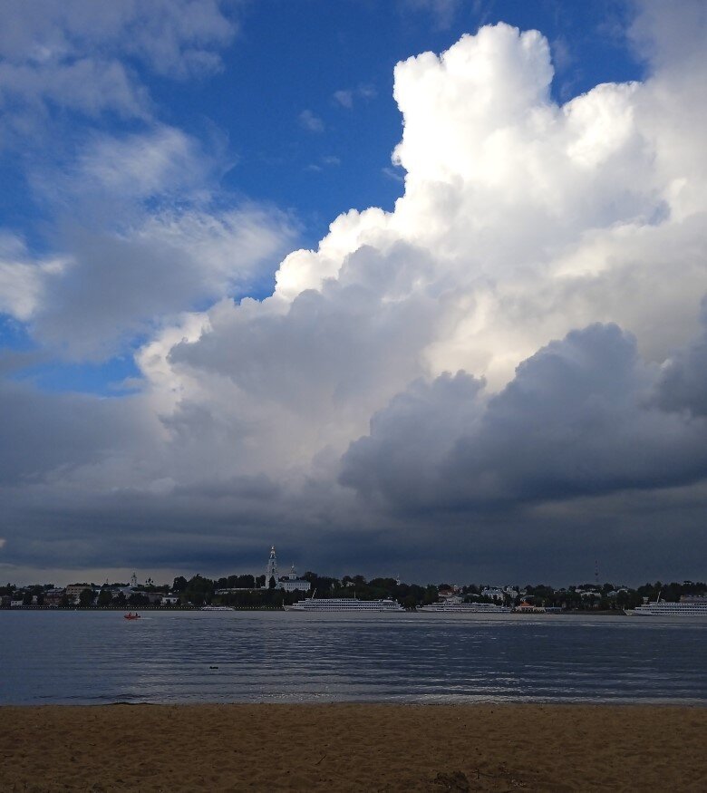 Нина Лебедева "Пётр и Павел - час убавил, а Илия Пророк два уволок". Точно! Заметно потемнели вечера. Грозы на Илию начались в конце июля: и льют, и угрожают по сей день. На Волге гроза, - это шквальный ветер, ниоткуда моментально влетевший в солнечный день. Низкие тучи, опустившиеся прямо на гребни волн, как черные паруса, и вода, - вскипающими потоками, рвущаяся из берегов, под вспышки молний и разрывающие удары грома. Ни земли, ни неба! Живая картина "Всемирного потопа". Всюду вода, вода, вода. Ильинский храм на главной улице Костромы.