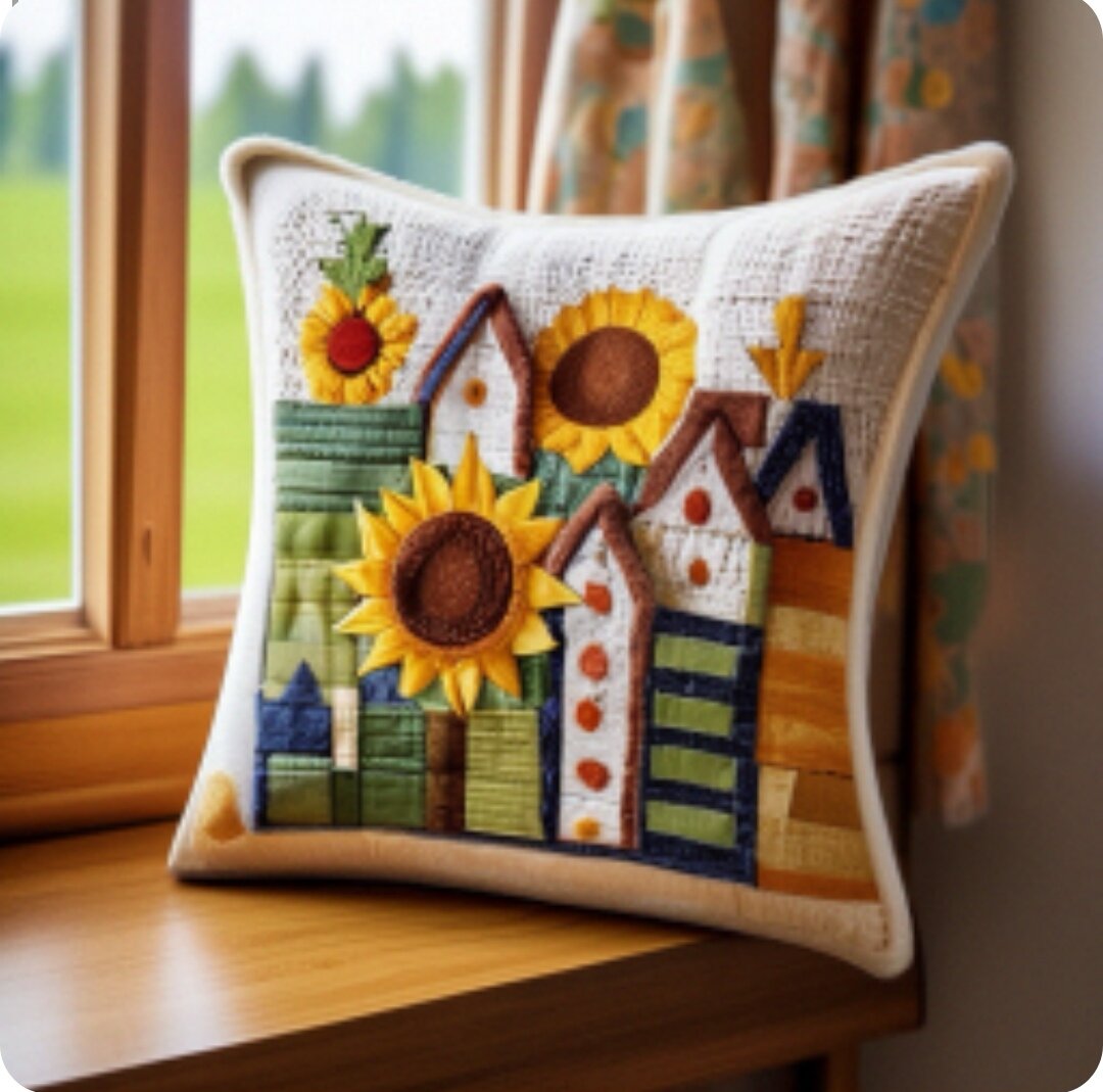 Предлагаю коллекцию интерьерных подушек с уютным домиком и солнечными подсолнухами - не пропустите интересную идею в стиле пэчворк.