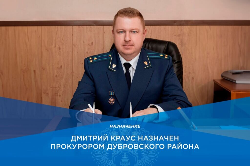 Приказом генерального прокурора на должность прокурора Дубровского района Брянской области назначен Дмитрий Краус. Об этом сообщает пресс-служба надзорного ведомства региона. Краус родился в 1980 году в Иваново. Окончил Брянский государственный университет. После окончания университета работал помощником прокурора Жуковского района, прокурором отдела по надзору за исполнением федерального законодательства прокуратуры, заместителем прокурора Жуковского района, прокурором Сельцо, прокурором по надзору за соблюдением законов в исправительных учреждениях области. Классный чин – старший советник юстиции. Прокуратуру Дубровского района Брянской области возглавил Дмитрий Краус