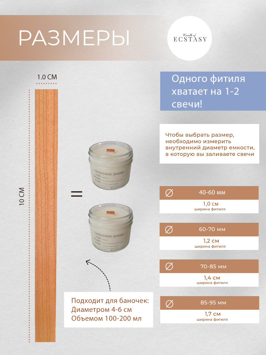 Наши деревянные фитили лучше всего сочетаются с соевым и кокосовым восками Всего в нашей линейке 3 размера. Но мы также делаем индивидуальные размеры. Пишите в телеграм https://t.me/candle_of_ecstasy от 10 000 – индивидуальная цена (телеграм https://t.me/candle_of_ecstasy) 1,0*10 см до 1000 шт. – 3,5 р/шт.