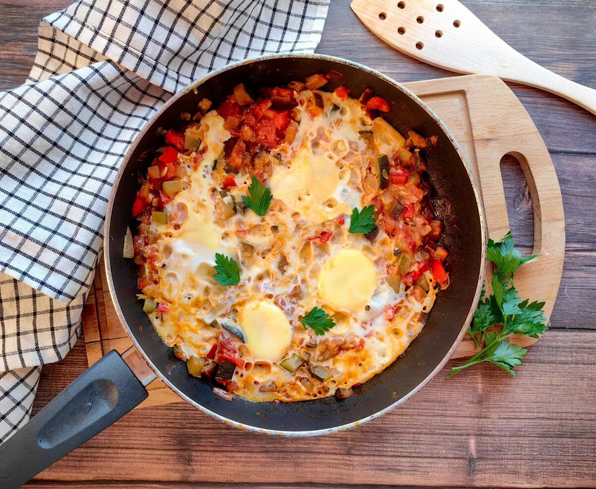 А еще вас там ждет бонус в виде 3-х рецептов завтраков из яиц. Овощи нарезать мелкими кубиками, чем мельче, тем лучше. На сковороде разогреть растительное масло, выложить лук и обжаривать его минуты 3. После добавить "крепкие" овощи: кабачки, баклажаны и перцы. Готовить минут 10, периодически помешивая. Следом добавить помидоры, чеснок, паприку, томатный соус (можно протереть помидоры, взять томатную пасту или кетчуп). Посолить и поперчить по вкусу. Также можно добавить любые любимые специи и приправы. Готовить на слабом огне под крышкой минут 15. После сделать небольшие углубления и разбить в них по