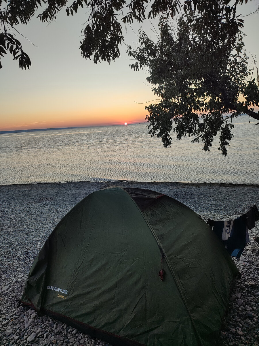 Волгоградская область. 15 августа Проснулся на рассвете и смотрел, как алая капля поднимается из водной глади. На берегу ещё несколько желающих расставили кресла и с горячими кружками следили за утренним действием. Рядом рыбаки готовили к спуску на воду свои лодки. Было слишком рано для полного подъёма, я лишь вывесил на палатку солнечную панель, и снова забрался в спальник, раз уж солнце вышло на работу, то нужно пользоваться бесплатной электроэнергией. А мне ещё нужно отдыхать, у меня смена начинается позже. Когда стало жарко я и сам залез в воду, чтобы подобно светилу явиться новому дню. Пафосно? Нууу, не знаю...) Чистил зубы, готовил завтрак, бродил по берегу. Ветер заставил собраться раньше, иначе он бы просто раздавил палатку. За прекрасную стоянку пришлось расплачиваться шестикилометровым подъёмом в гору, с которого вчера на радостях я лихо слетел, а сегодня тащился в него целый час, и вылез на трассу прилично уставший. На трассе всё попрежнему. Жара. Только взбитые о