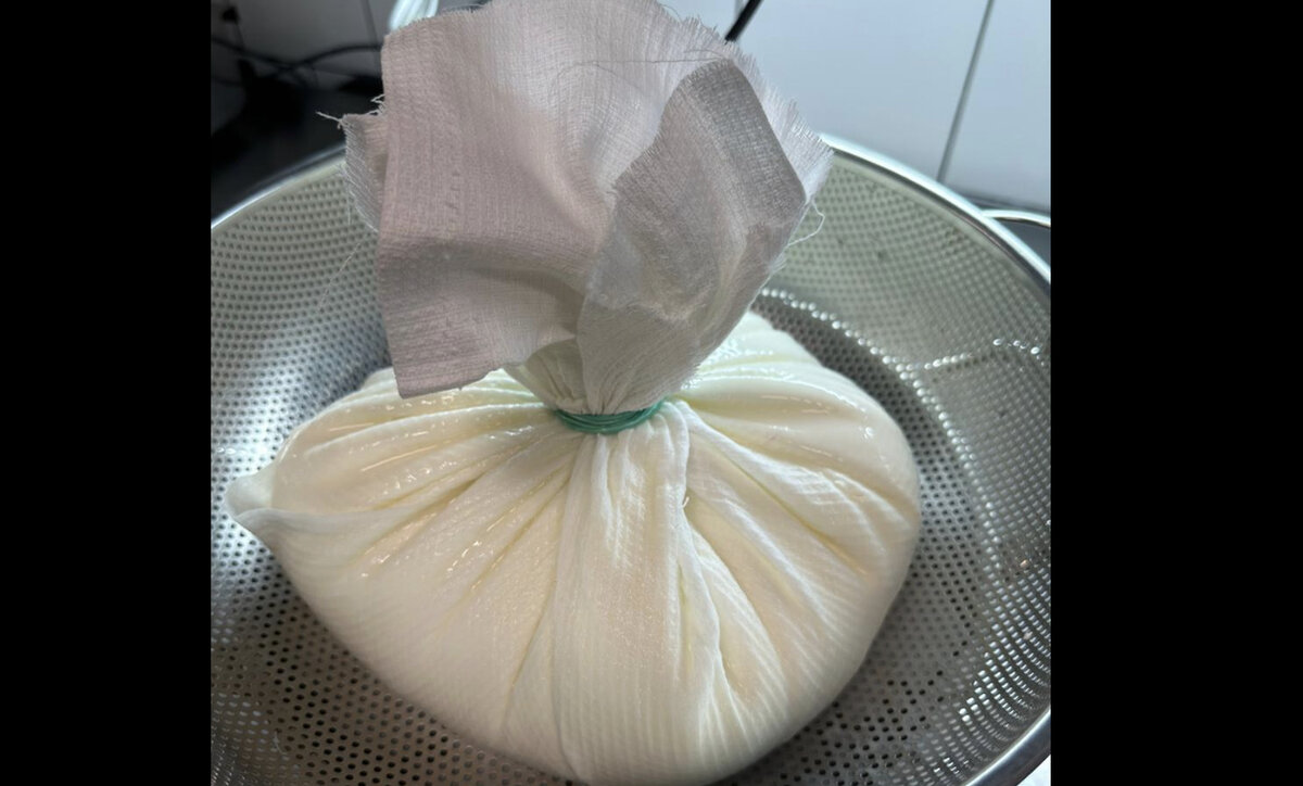 После чего поместили этот «узелок» под пресс на сито. После сеятия полотенца, получился великолепный мягкий сыр. Текстура полотенца правда осталась на нём. Но это всё мелочи