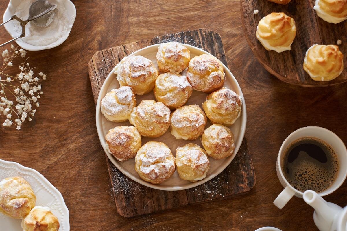 Чтобы наполнить наши пирожные кремом, можно использовать кондитерский шприц. Готовые профитроли можно подавать к несладкому чаю или кофе.