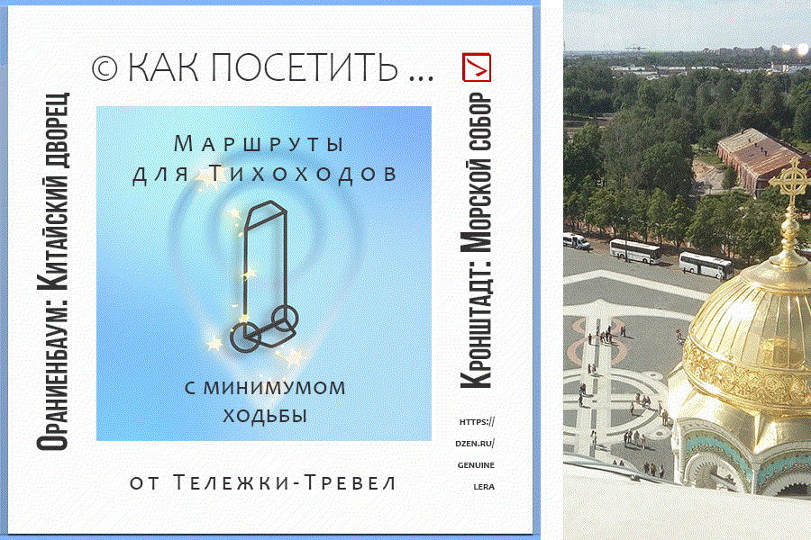 А почему обязательно в два разных пункта за один день, спросите вы, почему не погулять вместо того по парку Ораниенбаума и пройти до других объектов в нём же. Конечно, в Ораниенбауме не проблема найти где погулять… но если вы так спросите, значит, вы не тихоход, то есть можете позволить себе роскошь длительной пешей ходьбы! По парку не поехать на машине. А ходить столько подряд для тихохода невозможно. В этом суть. И отдохнуть ему в парке негде. Скамейки жёсткие, газоны низкие. (Даже если бы разрешалось на газонах сидеть/лежать). Передышки помогают, но передышки — ещё не отдых. В Кронштадт из Ораниенбаума едем на такси минут 30--40, за это время в салоне такси можно всё-таки отдохнуть.