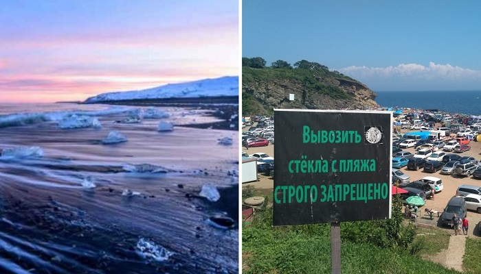 Такое название бухта под Владивостоком получила благодаря пляжу, усыпанному осколками стекла. В солнечные дни сияние видно за сотни метров. Когда-то давно жители Приморского края обходили это место стороной, опасаясь неприятного запаха. Источником являлась мусорная свалка «Горностай», располагавшаяся у сегодняшней Стеклянной.