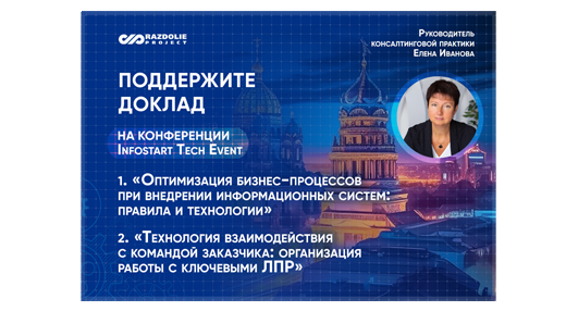 Руководитель консалтинговой практики ВЦ «Раздолье» Елена Иванова предлагает на конференцию Infostart Tech Event 2023 два доклада.