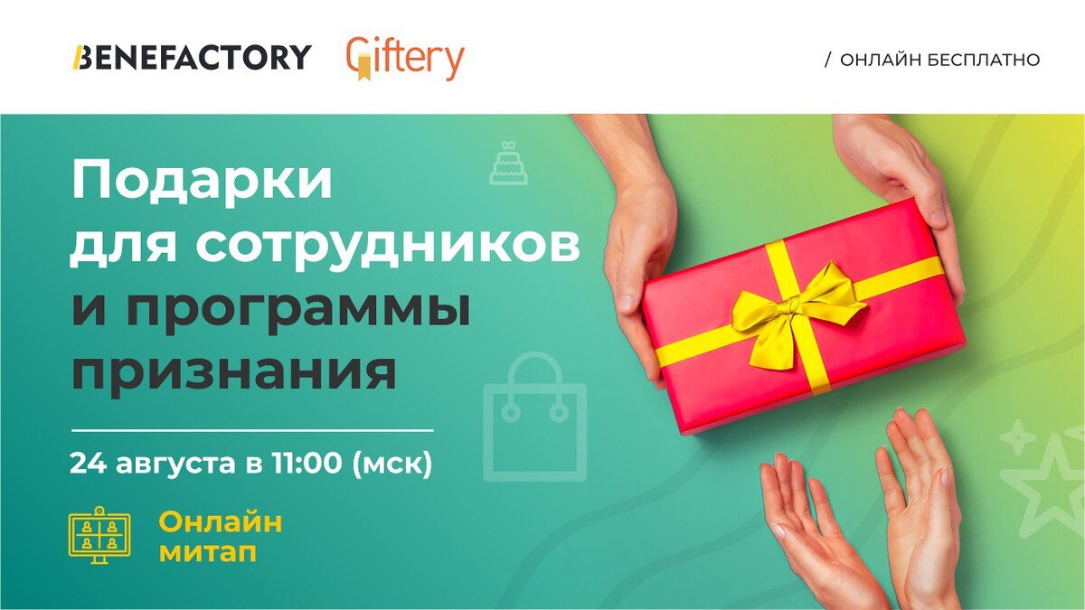 Приглашаем вас на онлайн митап совместно с компанией BENEFACTORY на тему "Подарки для сотрудников и программы признания". На встрече мы обсудим: ✔️Какие бенефиты выбирают работодатели для подарков и программ признания ✔️Какие бюджеты выделяют работодатели ✔️Среднюю утилизацию бюджета ✔️Автоматизацию программ признания ✔️Способы поздравлений сотрудников: рассылка по СМС, e-mail или брендированные открытки в конвертах ✔️Повышение вовлеченности сотрудников через геймификацию ✔️Кейсы успешно реализованных подарков для сотрудников и программ признания Регистрируйтесь по ССЫЛКЕ, задавайте вопросы. Авторы самых интересных вопросов получат ценные подарки от Giftery и BENEFACTORY! Запись митапа и презентации спикеров будут отправлены по почте всем зарегистрированным участникам. Если вы хотите узнать о других мероприятиях компании BENEFACTORY, напишите на hello@benefactory.ru